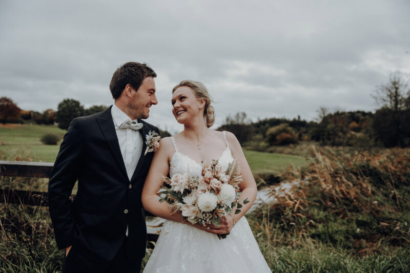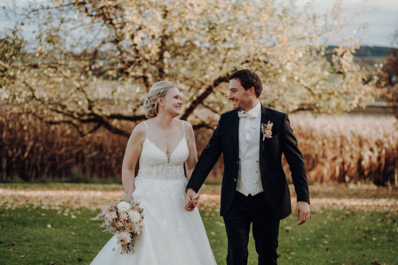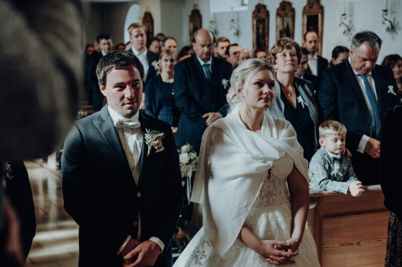 Eine Oktoberhochzeit mit ganz viel Tradition. Die Mama der Braut half beim Anziehen, Markus holte in der Früh dann seine Braut bei den Eltern zu Hause ab. Gemeinsam haben wir schöne Orte für das Shooting gesucht und als der Wind dann doch zu kalt wurde, ging es zum Weißwurstfrühstück, wo auch schon der Hochzeitslader auf das Brautpaar wartete. Nach der Kirche ging es mit einem Traktor zur Location.