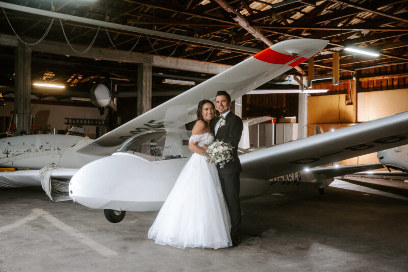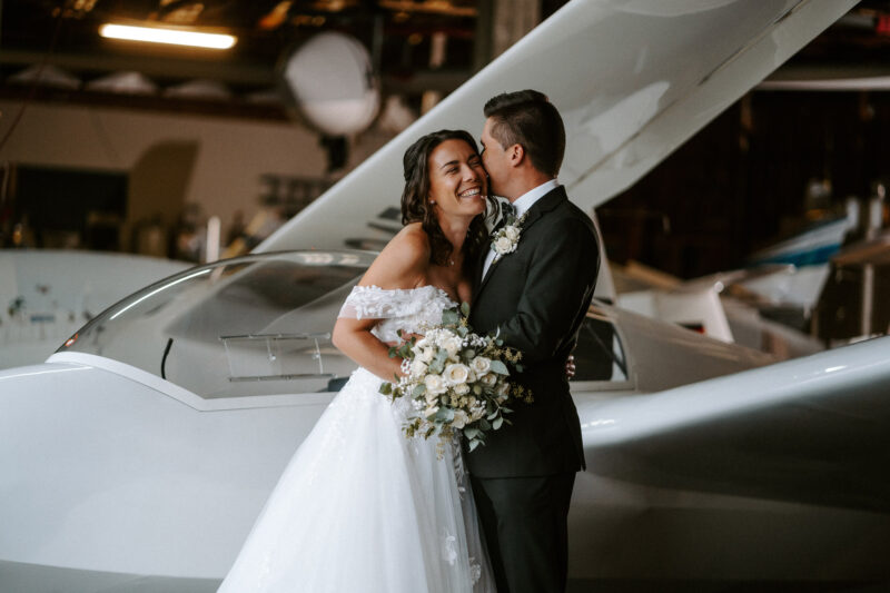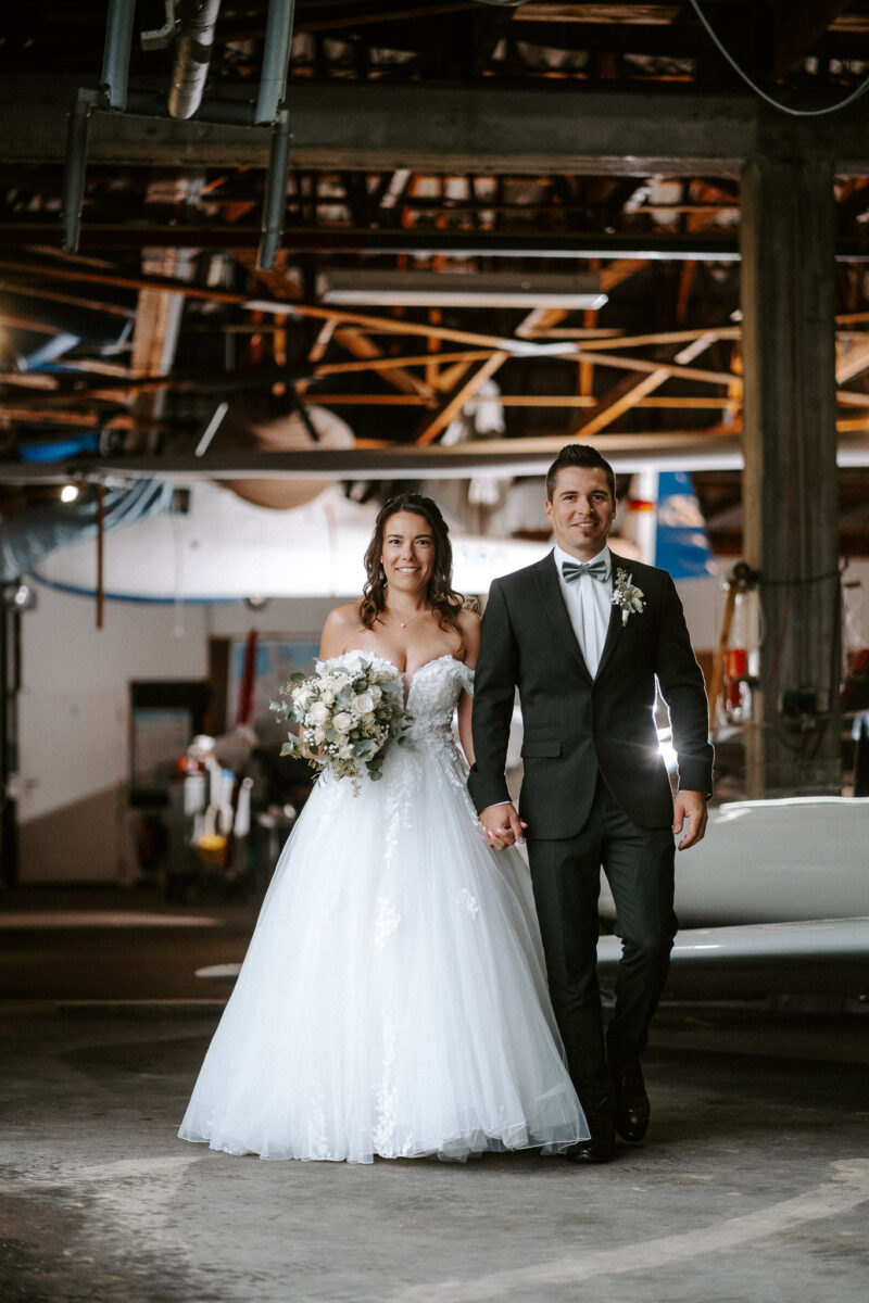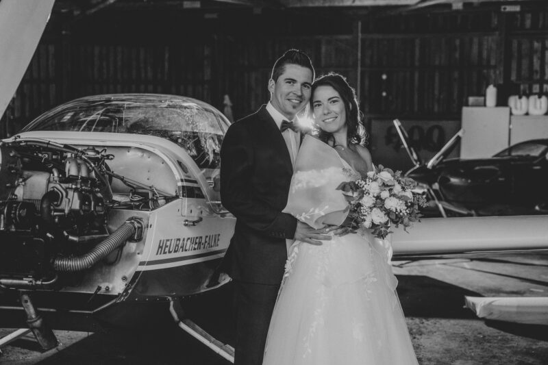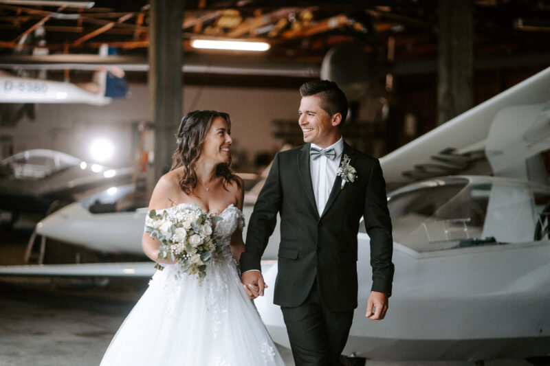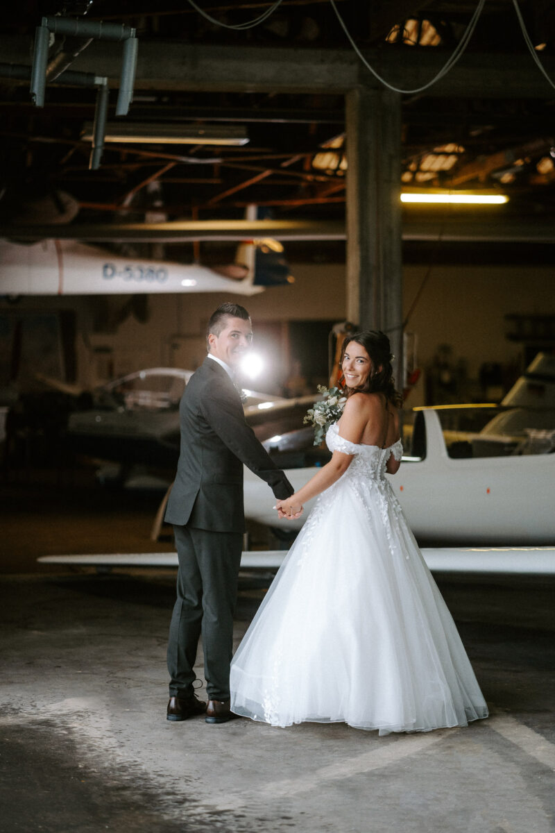 Die ganze Woche zuvor haben wir hin und her überlegt, was denn die beste Fotolocation für Verena und Christoph wäre. Ursprünglich wollte der Bräutigam ein Shooting auf der Startbahn des Flugplatzes mit einem eingeflogenen Flugzeug. Somit haben wir am Ende entschieden, dass wir in der Fliegerhalle fotografieren, wenn es wirklich so regnen sollte, wie es der Wetterbericht angesagt hatte. Ich finde es nach wie vor MEGA.